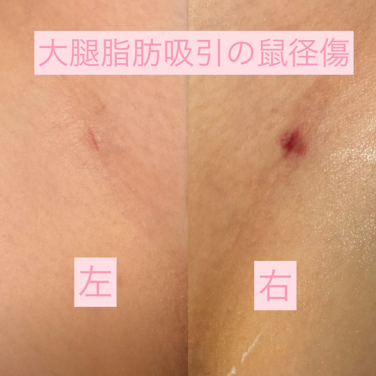 これって大腿脂肪吸引後ダウンタイムケアにいらしている20代のお客様の鼠経の傷なんですが、同じ日に写真を収めたんです!