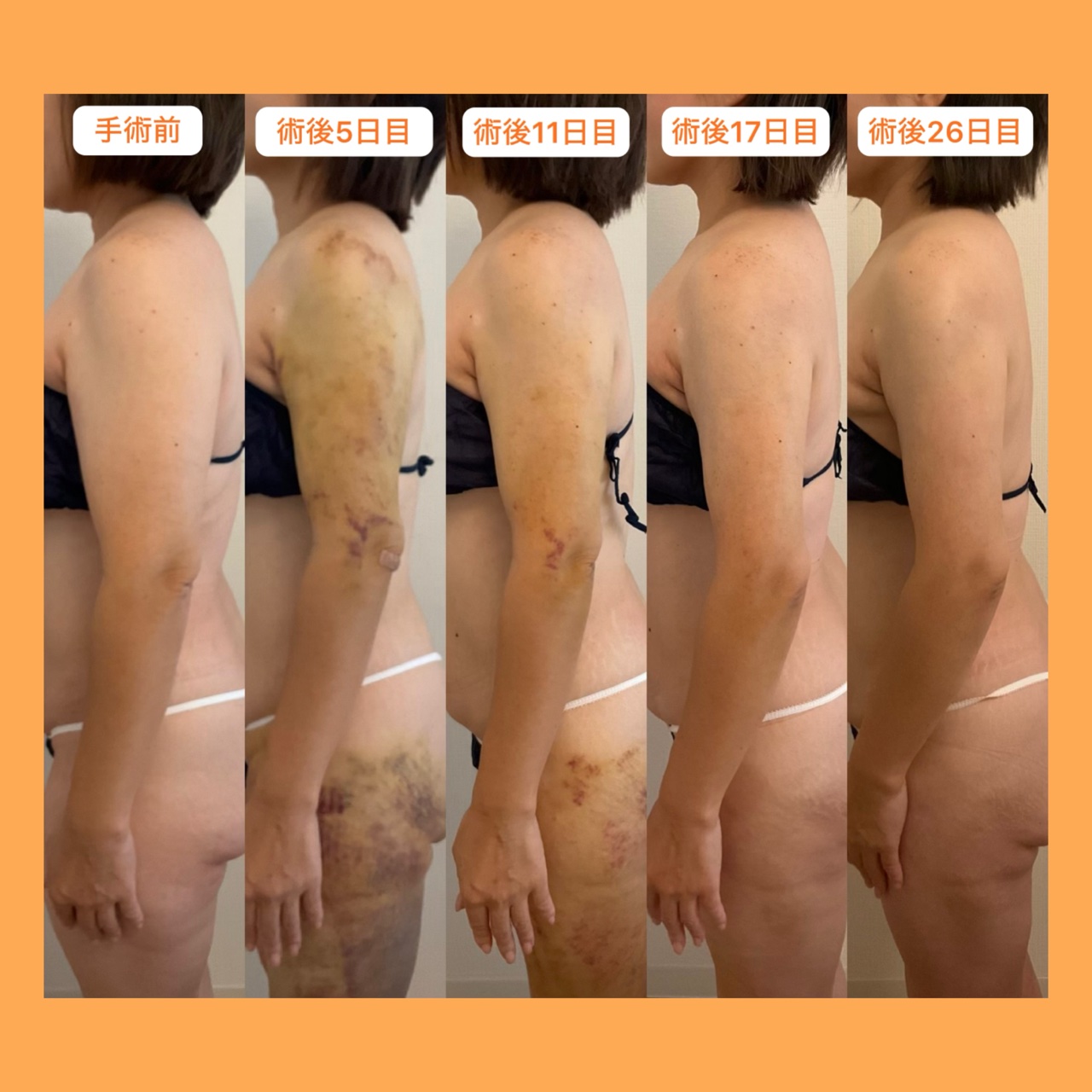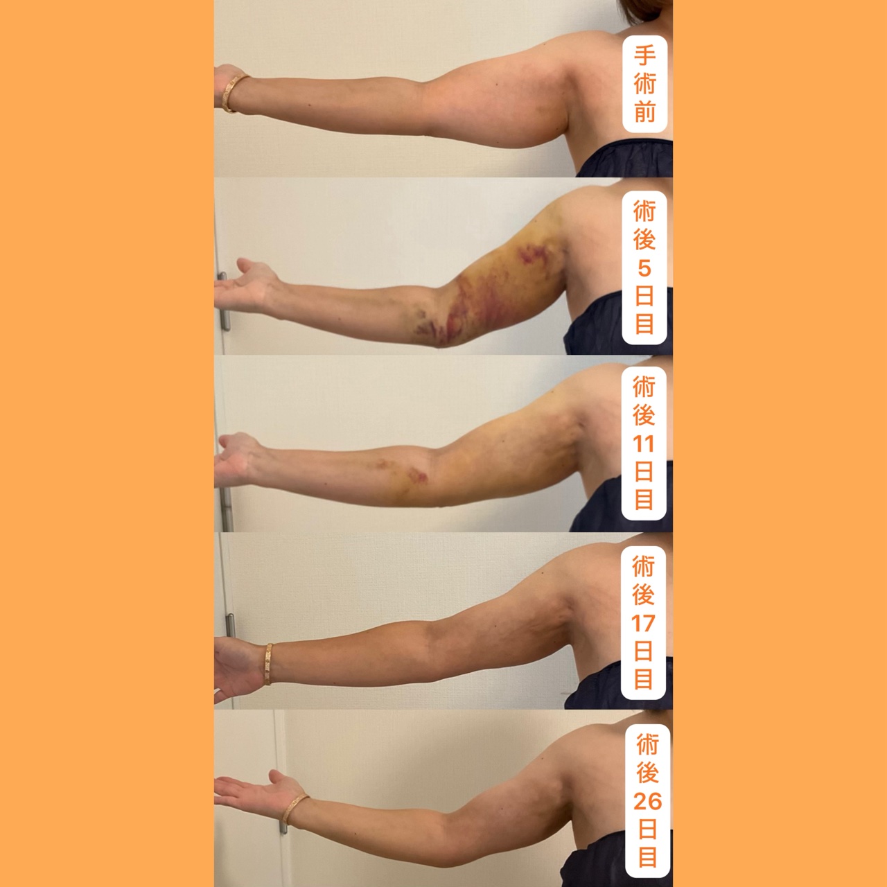 内出血のピーク(5日目)さえ乗り越えれば、その先にはノースリーブを着こなす夏が待っています。